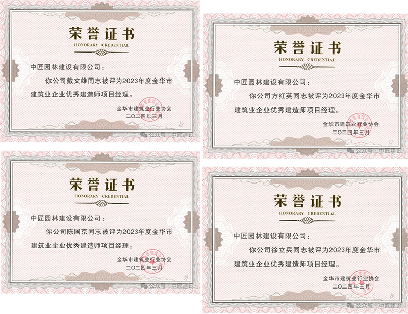 與此同時,公司的杰出人才也獲得了應(yīng)有的認可。戴文雄、方紅英、陳國京、徐立兵四位優(yōu)秀項目經(jīng)理,憑借其卓越的領(lǐng)導(dǎo)力和項目管理能力,榮獲2023年度金華市建筑業(yè)企業(yè)優(yōu)秀建造師項目經(jīng)理稱號。